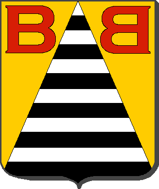 Burelé d'argent et de sable, chapé d'or chargé de deux B capitales de gueules affrontées en chef .