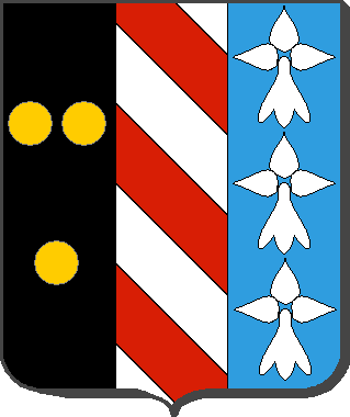 Tiercé en pal : au 1er de sable, à trois annelets d'or rangés en pal ; au 2e d'argent, à trois bandes de gueules ; au 3e d'azur, à trois mouchetures d'hermine d'argent rangées en pal.