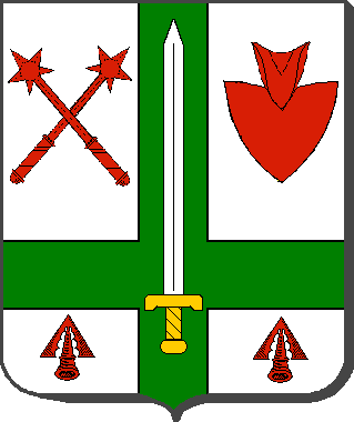 D'argent, à la croix abaissée de sinople chargée d'une épée haute d'argent garnie d'or, cantonnée en chef à dextre de deux masses d'armes passées en sautoir, à senestre d'un soc de charrue, et en pointe de deux phéons le tout de gueules.