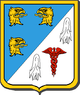 Taillé : au 1er d'azur, à trois têtes d'aigle arrachées contournées d'or, les deux du chef affrontées ; au 2nd d'argent, au caducée de gueules, accompagné de deux ombres d'écheveaux de laine ; à la filière d'or brochant la partition.