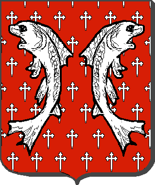 Parti : au 1er de gueules, au saumon d'argent ; au 2nd d'azur, au bar contourné d'or.