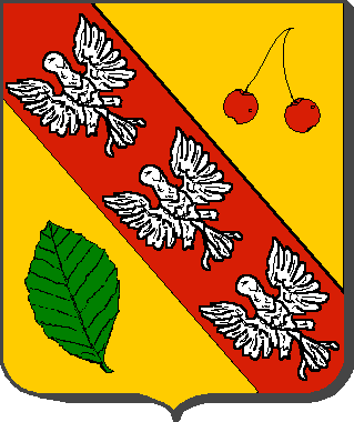 D'or, à la bande de gueules chargée de trois alérions d'argent, accompagnée en chef de deux cerises attachées de gueules, et en pointe d'une feuille de hêtre de sinople.