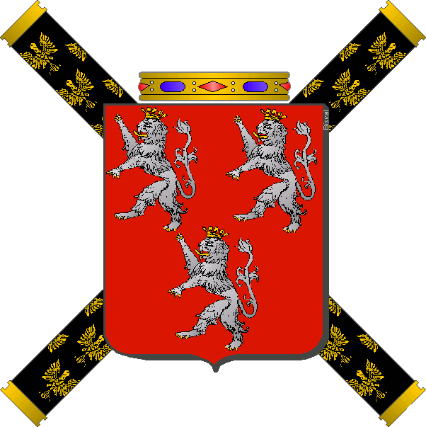 De gueules, à trois lions d'argent, armés, lampassés et couronnés d'or, 2 - 1. |