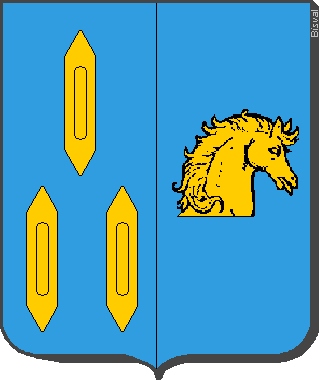 Parti d'azur, à trois navettes d'or mises en pal (1 - 2) ; et d'azur, à une tête de cheval contournée d'or.