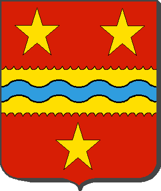 De gueules, à la fasce engrêlée d'or, chargée d'une divise ondée d'azur, et accompagnée de trois étoiles aussi d'or, 2 en chef et une en pointe.