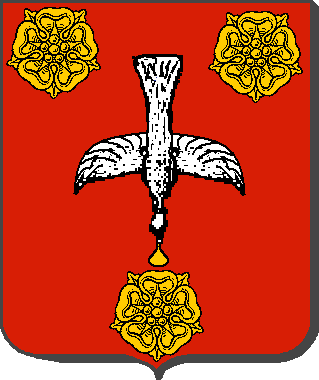 De gueules, à la colombe fondant d'argent tenant en son bec la Sainte Ampoule d'or, accompagnée de trois roses du même.