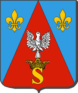De gueules, à l'alérion d'argent soutenu de la lettre capitale S couronnée d'or ; chapé cousu d'azur chargé de deux deux fleurs de lys aussi d'or.