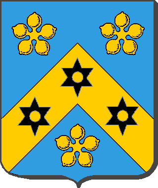 D'azur, au chevron d'or chargé de trois molettes d'éperon de sable, et accompagné de trois roses aussi d'or, deux en chef et une en pointe.