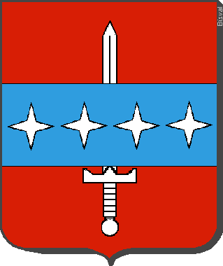 De gueules, à l'épée d'argent mise en pal la pointe en haut ; à la fasce d'azur chargée de quatre étoiles à quatre branches d'argent brochant sur le tout.