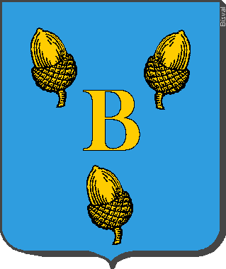 Parti : au 1er d'azur semé de croisettes recroisetées au pied fiché d'or, à deux bars adossés du même brochant ; au 2nd d'or, à trois fasces de sable.