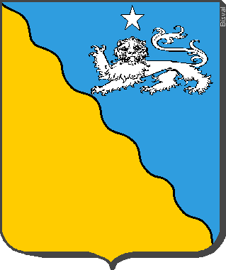 Parti : au 1er d'or, à la bande de gueules chargée de trois alérions d'argent ; au 2nd coupé, au I d'azur, à deux clefs d'or passées en sautoir, une épée basse du même brochant, au II de sinople, au sapin arraché d'argent.