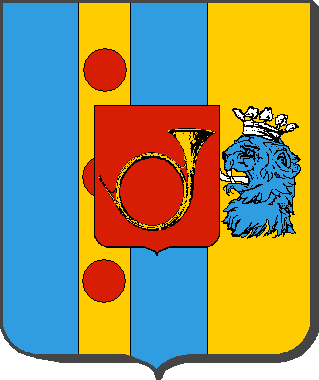D'azur, à un pal d'or chargé de trois tourteaux de gueules, flanqué d'or, à une tête de lion d'azur, armée, lampassée et couronnée d'argent (Fournier) ; sur-le-tout d'un écusson de gueules, chargé d'un cor de poste d'or.